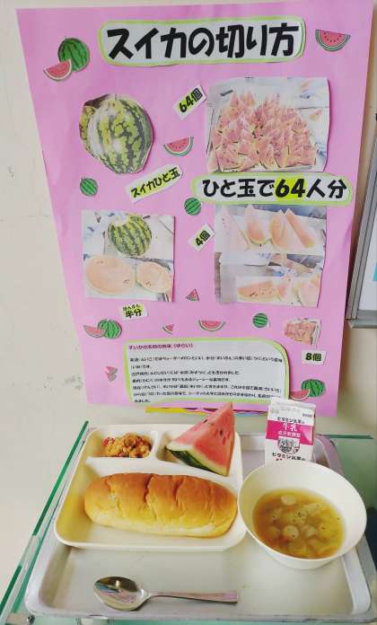 「すいか」は鳥取県産で、1人 1/64 切れずつです。