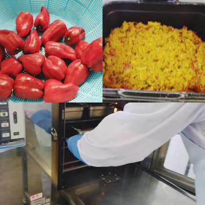 「パエリア」は、鶏肉、いかを主材に、赤ピーマンなどの野菜をオリーブ油でいためた後、米と調味料を加え、ミニバットで蒸し焼きにします。旬の赤ピーマンを使用し、ピーマンの赤色、さんどまめの緑色、カレー粉の黄色で彩りのよい仕上がりになります。