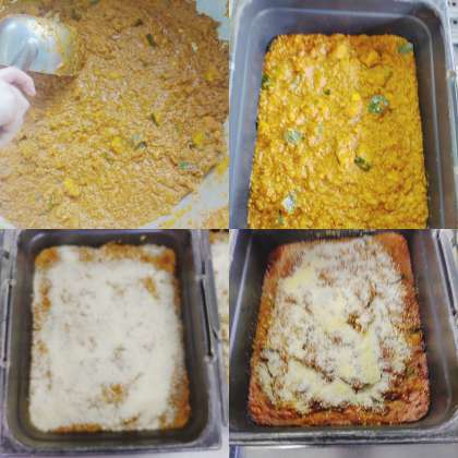「かぼちゃのミートグラタン」は、旬のかぼちゃの甘みと牛ひき肉、豚ひき肉の旨みがとてもよく合うケチャップ味のグラタンです。粉末チーズを使用していないので、乳アレルギーのある児童生徒も食べることができます。