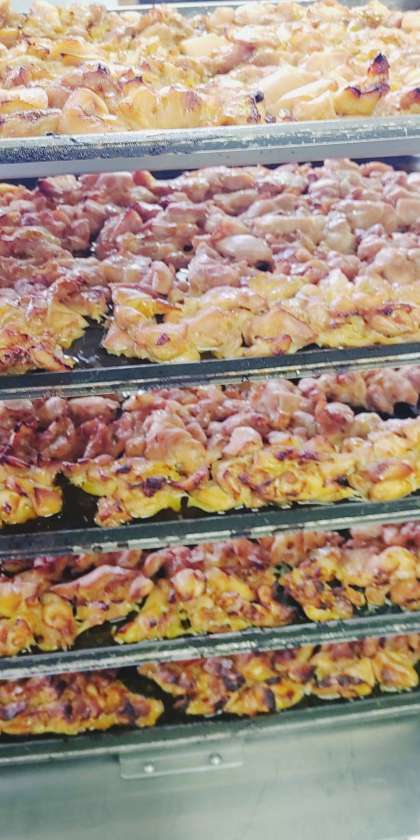 「鶏肉のてり焼き」は、料理酒、砂糖、みりん、こいくちしょうゆで下味をつけた鶏肉を、焼き物機で焼きます。