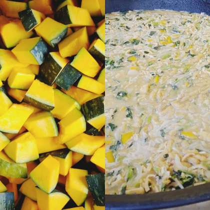 「みそ汁」は、うすあげ、かぼちゃ、たまねぎ、彩りにこまつなを使用したみそ汁です。 甘みのでるかぼちゃとたまねぎを使っているので、赤みその割合が多くなっています。