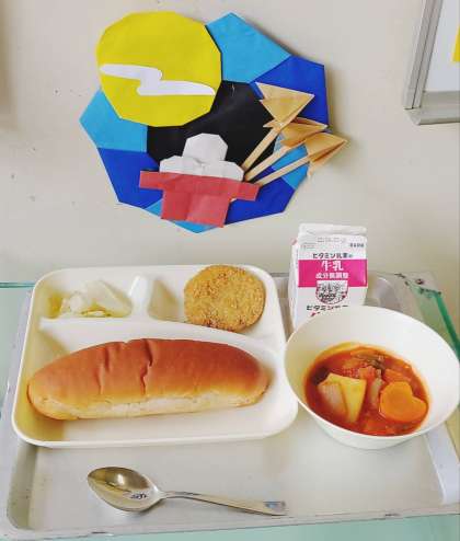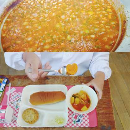 「ケチャップ煮」は、豚肉、じゃがいも、たまねぎ、にんじん、三度豆、トマト(缶)を使用し、トンカツソースやケチャップで味つけした煮ものです。