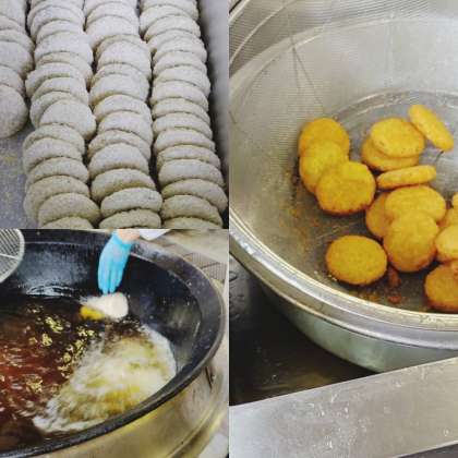 「 チキンレバーカツ」は、ほんのりカレー味がついて食べやすく、不足しがちな鉄分をとることができる一品です。170度の油であげています。小学校のカツは50gとなっています。