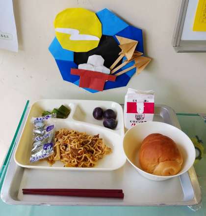 パン・焼きそば・オクラの甘酢あえ・ぶどう(巨峰)