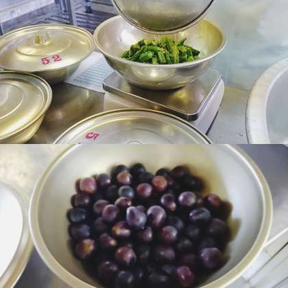 「ぶどう(巨峰)」が小学校は1人3粒ずつつきます。