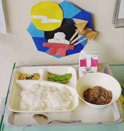 ごはん・マーボーなす・チンゲンサイとコーンの炒め物・えだまめ