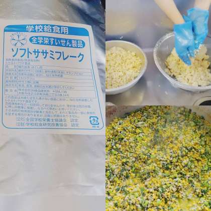 「チンゲンサイとコーンのいためもの」は、ささみ (油漬け 、コーン、下ゆでしたチンゲンサイをいため、塩、こしょう、こいくちしょうゆで味つけします。