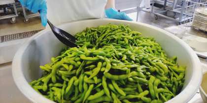 「えだまめ」は、焼き物機で蒸して、塩をふり、あえています 。