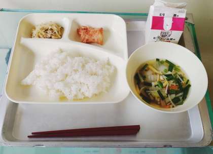ごはん・鶏肉のチリソース焼き・焼き豚とワンタンの皮のスープ・切り干し大根のごま辛みづけ