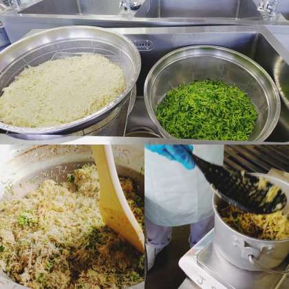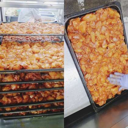 「鶏肉のチリソース焼き」は、鶏肉にしょうが汁、にんにく、砂糖、塩、こいくちしょうゆ、ケチャップ、トウバンジャンで下味をつけ、焼き物機で焼きます。