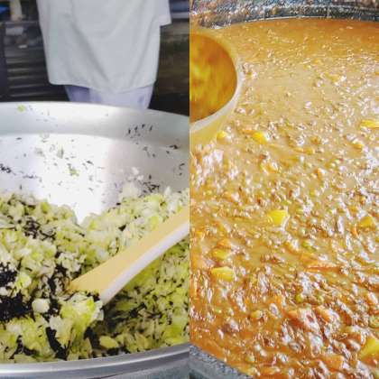 「ハヤシライス[米粉]」は、小麦アレルギーのある児童生徒も食べることができるように、上新粉を使っています。牛肉、じゃがいも、たまねぎ、にんじんなどを使い、水どき上新粉でとろみをつけ、調味料で味つけして煮こみます。