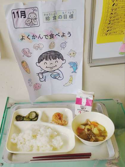 あげどりのねぎだれかけ・豚肉とじゃがいもの煮もの・きゅうりの赤じそあえ