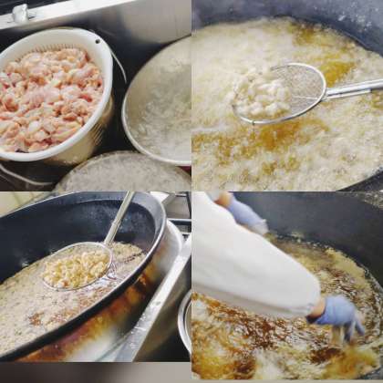 「あげどりのねぎだれかけ」は、鶏肉 に 料理酒、しょうが汁で下味をつけ、でん粉をまぶし、なたね油であげ、白ねぎ、砂糖、米酢 、こいくちしょうゆ、ごま油を合わせたタレをからませています。