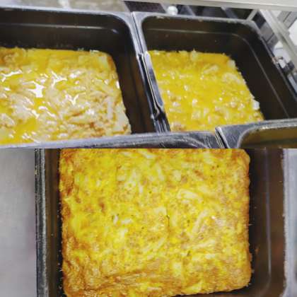 「ツナポテトオムレツ」は、液卵、ツナ、じゃがいもを使用し、焼き物機で焼きます。バター を使用して風味よく仕上げています。ケチャップが1人1袋つきます。