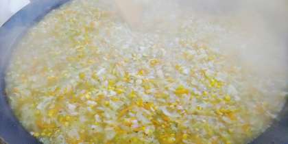 「鶏肉とキャベツのスープ」は、鶏肉、キャベツ、たまねぎ、コーン、にんじん、青みにパセリを使用しています。