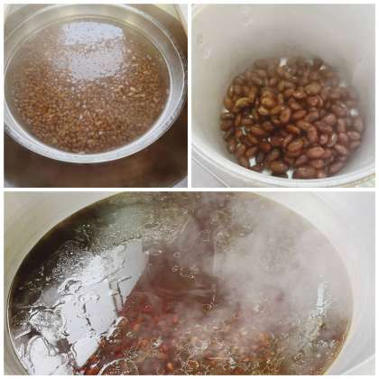 「うずら豆のグラッセ」は、熱湯に30分間ひたしたうずら豆を、釜で柔らかく煮ます 。今回は、バターの代わりにオリーブ油を使用しています。