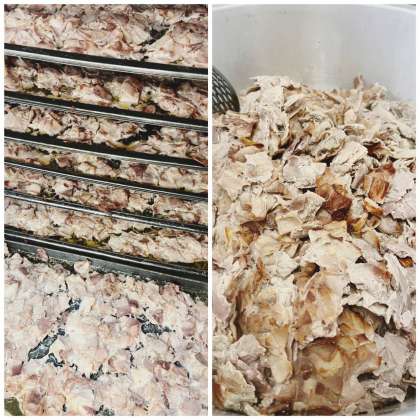 「ケチャップ煮」は、鶏肉、じゃがいも、たまねぎ、キャベツ、にんじん、青みにグリンピースを使用し、トマトピューレ、砂糖、塩、こしょう、ローレル、ケチャップ、チキンブイヨンで味つけしています。