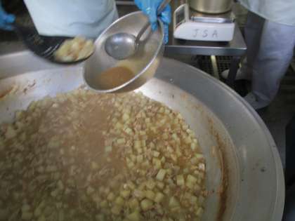 「鶏肉の甘辛焼き」は、鶏肉(もも皮無 大)を料理酒、砂糖、みりん、こいくちしょうゆで下味をつけ、たまねぎを混ぜ合わせ、焼き物機で焼きます。
