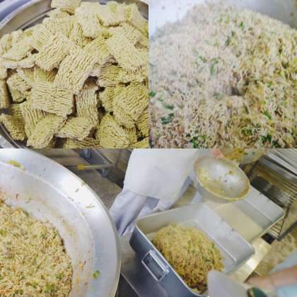 「和風焼きそば」は、 豚肉を主材に、塩、こしょう 、うすくちしょうゆ、こいくちしょうゆで味つけした焼きそばです。喫食時に、かつおぶしをかけていただきます。