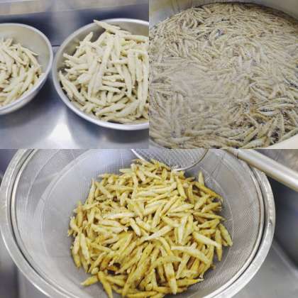 「きびなごてんぷら」は、冷凍のまま、170度のなたね油で揚げ、みりん、こいくちしょうゆで作ったタレをかけます。