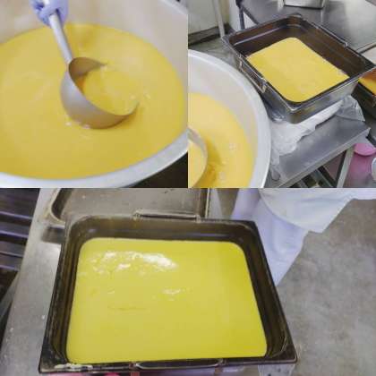 「卵どうふ」は、液卵をみりん、塩、うすくちしょうゆで味つけしただしとともにミニバットに入れ、焼き物機で蒸します。