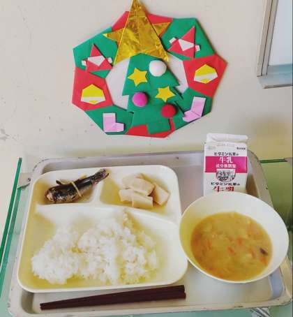 「みそ汁」は、じゃがいもと旬のはくさい、だいこん、にんじん、白ねぎ、しめじを使用 した、具だくさんの汁物です。