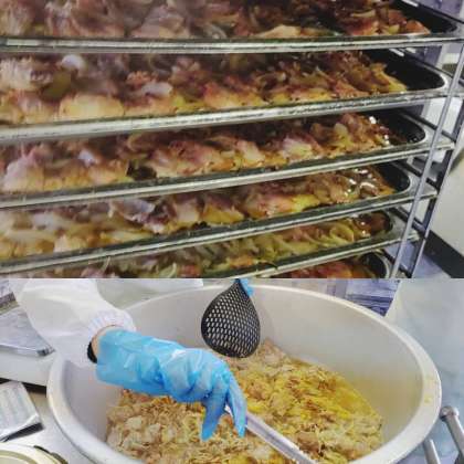 「豚肉のしょうが焼き」は、豚肉にしょうが汁、砂糖、料理酒、みりん、こいくちしょうゆ、綿実油で下味をつけ、たまねぎを混ぜ合わせ、焼き物機で焼きます。