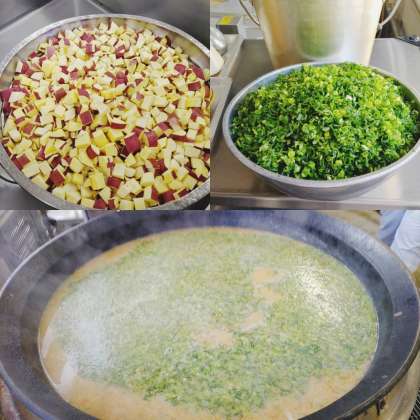 「さつまいものみそ汁」は、にぼしでだしをとり、鶏肉、さつまいも、にんじん、もやしを使用し、青みに青ねぎを入れます。
