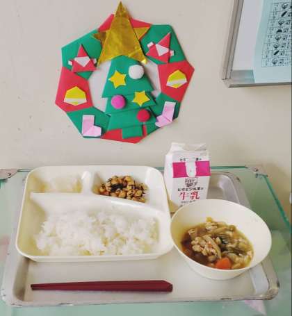 来年は、1月11日から給食開始です。献立は、きんぴらちらし・ぞう煮・ごまめ・きざみのりです。