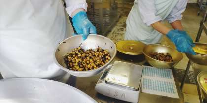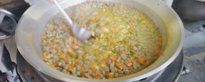 「ひじき豆」は、でん粉をまぶし、油であげた大豆に、ひじきが入った調味液をからませます。鉄や食物繊維を多く含む献立です。