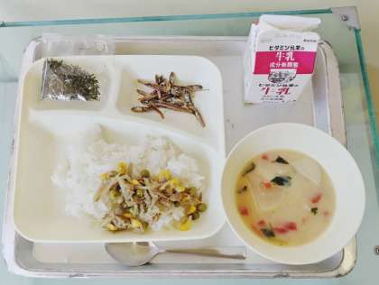 「きんぴらちらし」は、豚肉、ごぼう、コーン、グリンピース、かんぴょうを使用し、こんぶ(粉末)を加えて旨みを増した混ぜご飯です。喫食時に児童が混ぜ合わせてきざみのりをかけて食べます 。