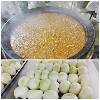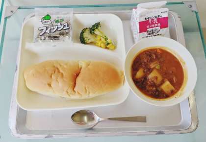 「ビーフシチュー」は、牛肉を主材に、小麦粉と綿実油で作ったブラウンルウで煮こみます。毎回好評な献立です。
