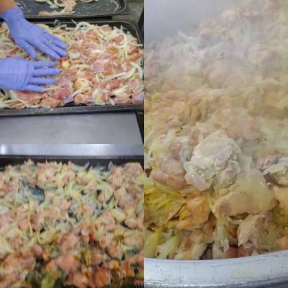 「鶏肉のゆず塩焼き」は、下味をつけた鶏肉にたまねぎを混ぜ合わせて、焼き物機で焼くゆずの風味をいかした献立です。
