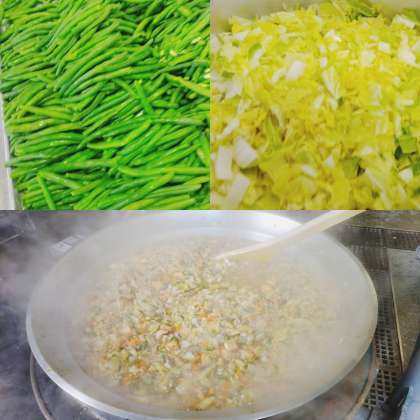 「あつあげと野菜の煮もの 」は、あつあげを主材に、はくさい、ごぼう、にんじん、しいたけ、青みにさんどまめを使った煮ものです。