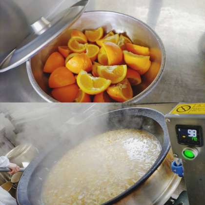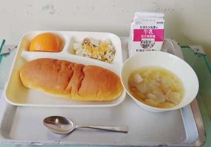 押麦のグラタン・豚肉と野菜のスープ・いよかん