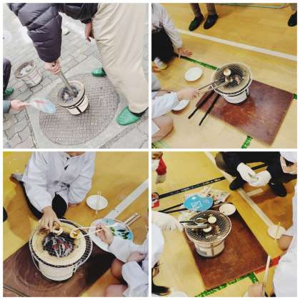 火をつけた七輪で、お餅を焼きました。自分たちでおこした火で焼いたお餅はとても美味しそうでした。きなこ・さとうしょうゆの味付けで食べました。