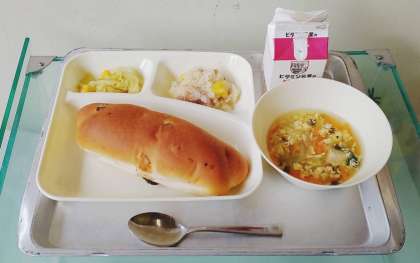 「中華おこわ」は、もち米 に焼き豚、くり、しいたけ、調味液を加えて、焼き物機で蒸し焼きにします。チキンブイヨンとごま油でコクと旨みを出した児童に人気の一品です。