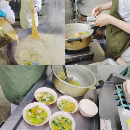「卵スープ」は、鶏肉、にんじん、たまねぎ、チンゲンサイを煮、液卵を流し入れます。