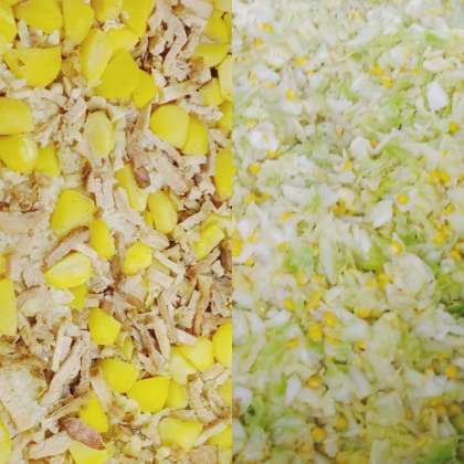 「キャベツのオイスターソースいため」は、キャベツ、コーンをいため、塩、こいくちしょうゆ、オイスターソースで味つけします。