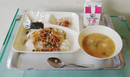 「鶏ごぼうご飯」は、しょうが汁で下味をつけた鶏ひき肉を主材に、つきこんにゃく、ごぼう、にんじん、グリンピースを使用しています 。児童に大変好評な混ぜご飯です。きざみのりが1人1袋ずつつきます。