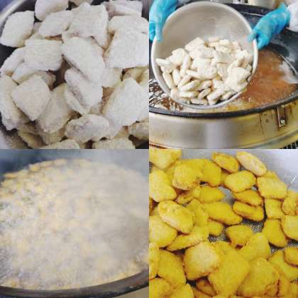 「カツ丼(どん)」は、一口トンカツは、170度のなたね油であげています。小学校は1人30gのものを使用しています。1人1コずつです。具は、たまねぎ、にんじん、青ねぎを煮て、液卵を流し入れます。配食時に具をごはんの上にかけ、一口トンカツをのせます。この献立は【鶏卵(液卵)】の個別対応献立です。