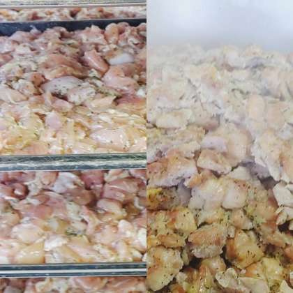 「鶏肉のバジル焼き」は、鶏肉に、白ワイン、塩、こしょう(粗挽)、バジル、オリーブ油で下味をつけ、焼き物機で焼きます。
