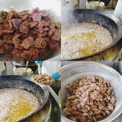 「くじらのオーロラ煮」は、しょうが汁、料理酒で下味をつけたくじらに、でんぷんをまぶしてあげ、ケチャップ、砂糖、赤みそで作ったタレをからませます。