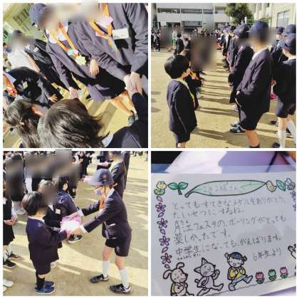 1年生から、メダルの贈呈がありました。6年生の為に心を込めて折り紙で一生懸命おりました。