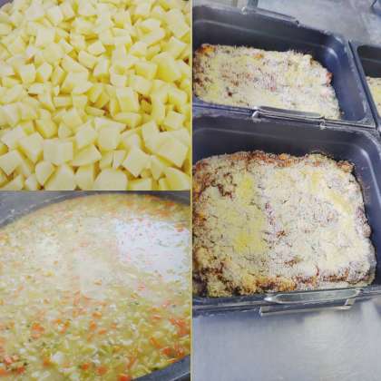 「押麦と野菜のスープ煮」は、鶏肉を主材に、押麦、じゃがいも、キャベツ、にんじん、グリンピースを使用したスープ煮です。