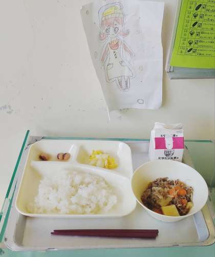「肉じゃが」は、牛肉を主材に、じゃがいも、糸こんにゃく、たまねぎ、にんじんを使用した児童に人気の定番献立です。