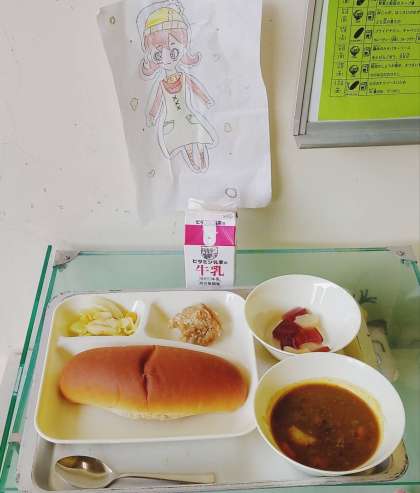 フライドチキン・カレーシチュー米粉・キャベツとコーンのサラダ・フルーツゼリー
