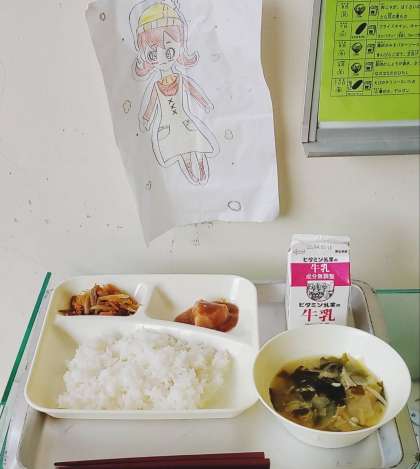 「五目汁」は、だしこんぶとけずりぶしでだしをとり、うすあげ、たまねぎ、キャベツ、えのきたけ、わかめを使用した汁ものです。