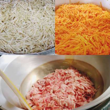「きんぴらごぼう」は、豚肉とささがきにしたごぼう、細切りのにんじんをいため、砂糖、こいくちしょうゆで甘辛く味つけした、ご飯によく合う一品です。