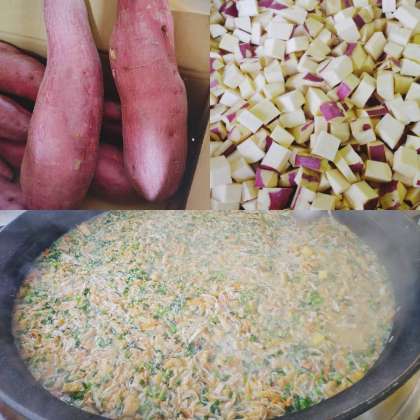 「さつまいものみそ汁」は、さつまいも、うすあげ、にんじん、もやし、青みに青ねぎを使用しています。